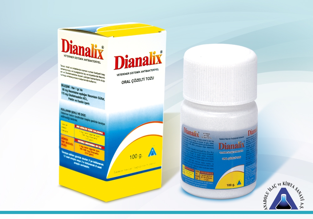 COMPOSITION: DIANALIX® Oral Solution Powder is a yellow colored, homogeneous powder. Each g contains 175 mg of oxytetracycline HCl and neomycin sulfate equivalent to 85 mg of neomycin.